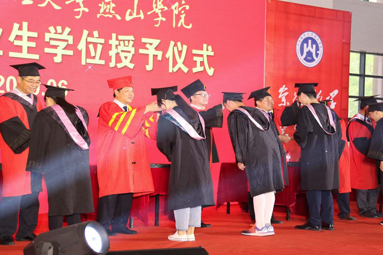 学位授予仪式环节,学位委员会主席刘瑞波教授身穿校长服,学位委员会成员身穿导师服,与走上主席台的毕业生亲切握手,逐一为他们拨穗正冠、颁发学位证书,并与他们拍照留念,让他们为四年拼搏的自己而感到骄傲,享受拼搏后的荣誉。