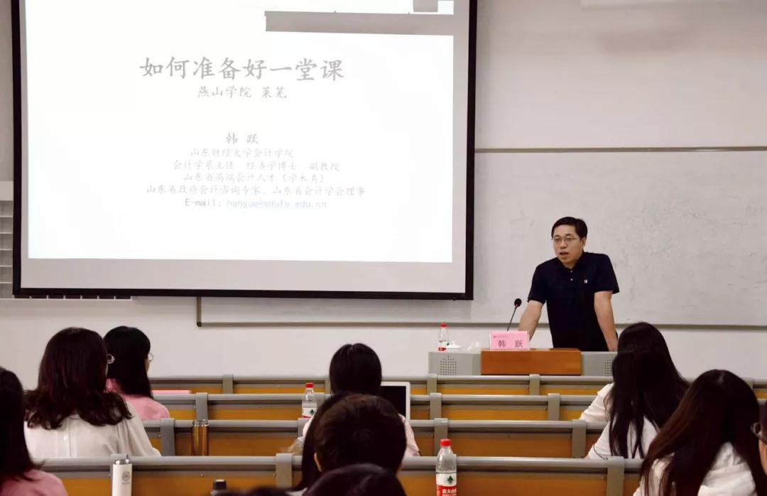 致辞结束后,山东财经大学会计学院副教授韩跃以“如何准备好一堂课”为题展开培训。首先,他以自身经历为切入点,从缺乏经验、角色转变、环境改变三方面总结新任教师的困惑,并针对此类困惑提出“避免照本宣科,精确把握时间”的解决对策。随后,韩教授从备课、教案、板书、教学语言、教学方法五个教学艺术对备课作出详细分析。最后,他以《中级财务会计》课程为例,向青年教师们讲述备课中应该注意的问题。