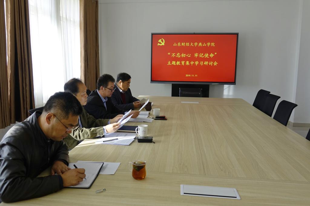 11月11日上午,山东财经大学燕山学院党委领导在莱芜校区四楼会议室举行“不忘初心、牢记使命”主题教育第三次集中学习研讨。本次集中学习研讨围绕“牢记使命、担当作为”主题进行,党委书记王松主持学习研讨,党委全体成员参加。