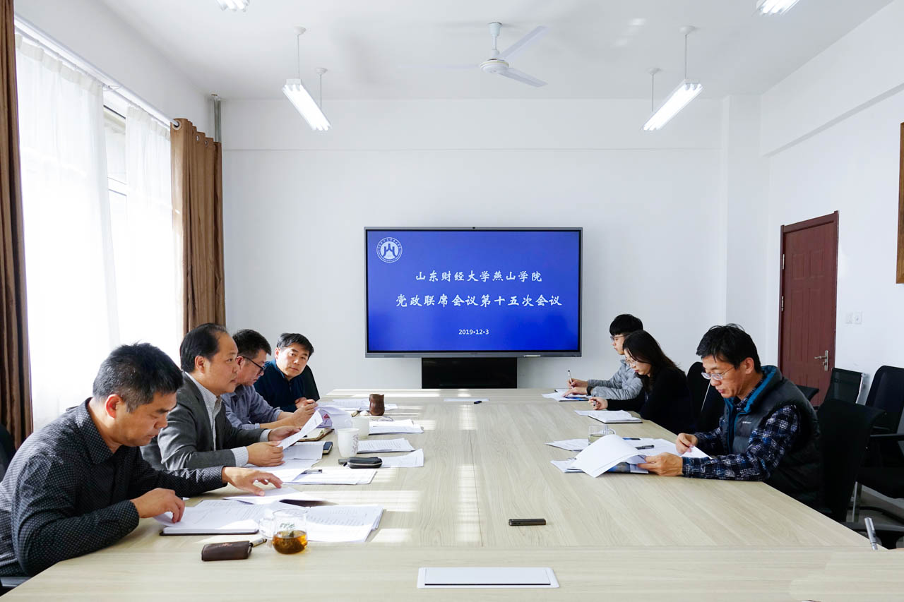 12月3日上午,山东财经大学燕山学院党政联席会第十五次会议在莱芜校区办公楼四楼会议室召开。院长刘瑞波、党委书记王松、副院长魏新刚、党委副书记张红旗出席会议,各相关处室负责人列席会议。