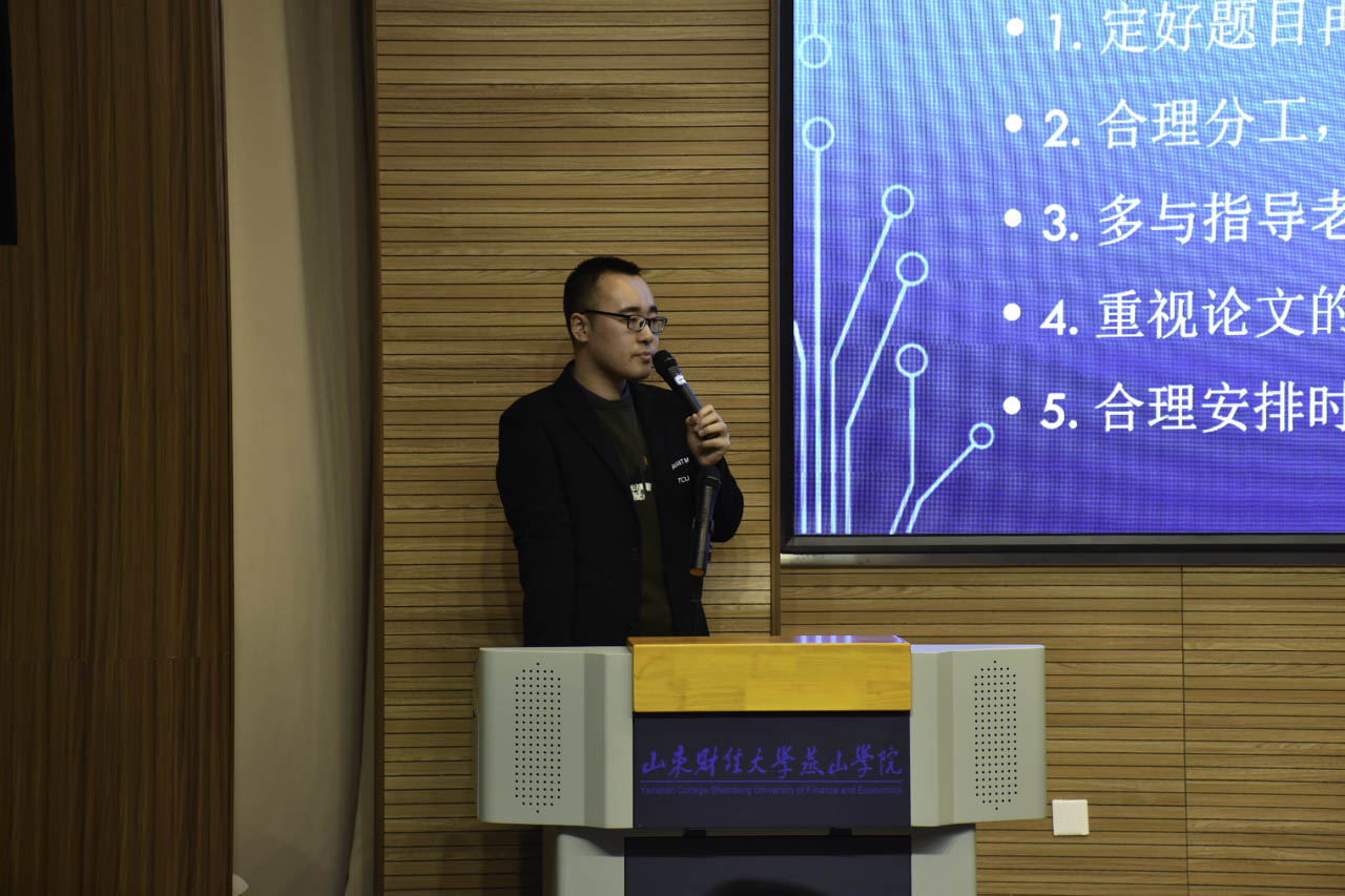 我校邀请第16届“挑战杯”全国大学生课外学术科技作品竞赛优秀选手乔怡、第十五届“华为杯”中国研究生数学建模竞赛优秀选手赵宇洋、“互联网+”大学生创新创业大赛优秀选手李海天为大家进行经验分享。全国大学生数学建模竞赛国家三等奖获得者赵宇洋以“何为数学建模”、“数学建模的赛制”、“往年比赛题目的介绍”等方面为切入点使在场观众对数学建模竞赛有了初步了解。随后,他对论文的撰写、参赛的注意事项进行了重点讲解,指出论文撰写中摘要、思路描述等方面的重要性,并结合自身经验为在场观众讲述了参赛的赛前准备以及赛中事项。紧接着,“挑战杯”全国大学生课外竞赛一等奖获得者乔怡以自身的参赛经历着重与同学们分享了组队经验、如何选题、前期准备等六个方面。她提出文本写作中逻辑与细节的重要性,强调细节决定成败,切忌出现无中生有,一定要立足调查研究。她凭借简洁的语言、清晰的的思路、丰富的经验赢得在场观众的阵阵掌声。最后,“互联网+”大学生创新创业大赛金奖获得者李海天首先以其团队的调研视频使现场观众对其团队的调研项目进行初步的了解。随后,他针对参赛项目“玫菌子”为在场观众讲述了自身的参赛经历以及经验分享。现场观众认真聆听、随手记录、受益匪浅。