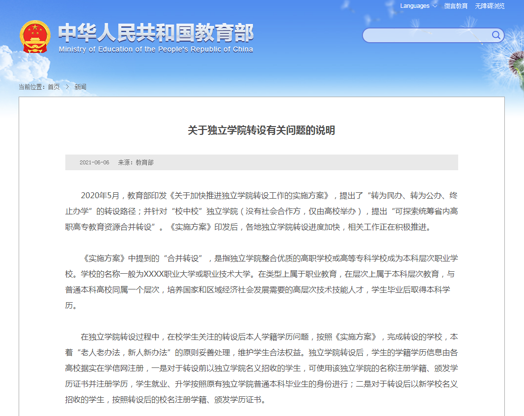 2020年5月,教育部印发《关于加快推进独立学院转设工作的实施方案》,提出了“转为民办、转为公办、终止办学”的转设路径;并针对“校中校”独立学院(没有社会合作方,仅由高校举办),提出“可探索统筹省内高职高专教育资源合并转设”。《实施方案》印发后,各地独立学院转设进度加快,相关工作正在积极推进。