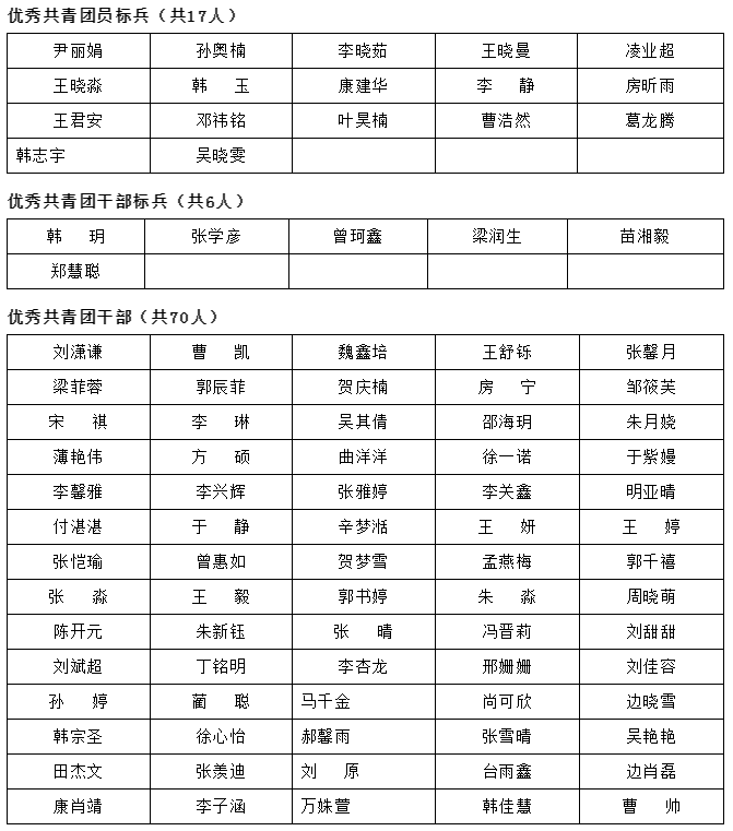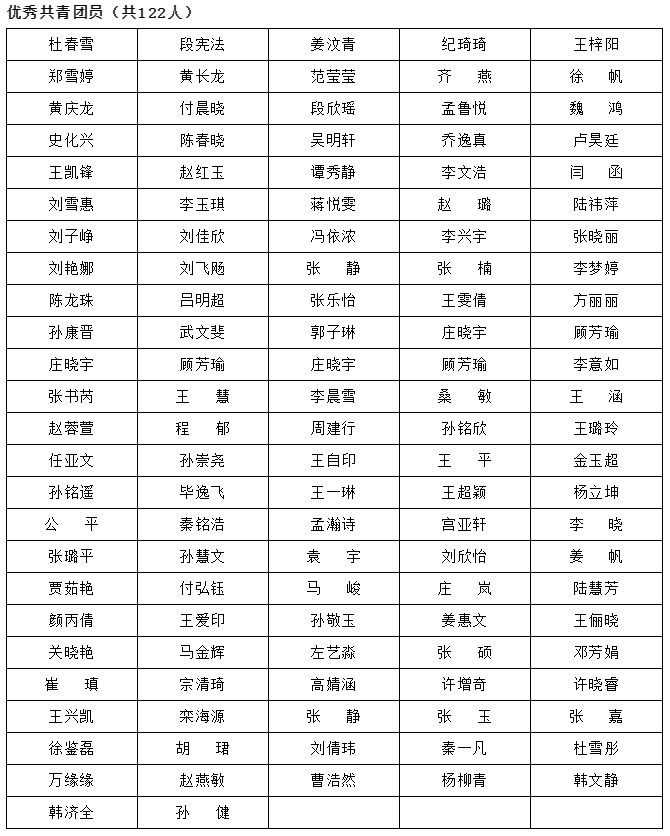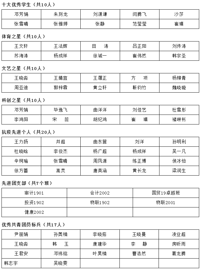 为继承和发扬“五四”精神,进一步表彰先进,树立典型,弘扬正气,激励广大团员青年努力学习、勤奋工作、积极进取、不断创新,推动我校团学工作再上新台阶,我校开展了山东财经大学燕山学院“十大优秀学生”、“文体科创之星”、“抗疫先进个人”、“优秀共青团员、团干部”“先进团支部”的评定,按照《关于评选山东财经大学燕山学院“十大优秀学生”的通知》《关于评选山东财经大学燕山学院“文体科创之星”的通知》《关于开展“抗疫先进个人”评选工作的通知》《关于做好2021-2022学年先进团支部、优秀共青团干部、优秀共青团员评选工作的通知》的要求,本着“公开、公平、公正”的原则,经自主推荐、辅导员初审、团总支审核及评审小组综合决议,评选“十大优秀学生”10名、“体育之星”10名、“文艺之星”10名、“科技之星”10名、“抗疫先进个人”20名、“先进团支部”7个、“优秀共青团员标兵”17名、“优秀共青团干部标兵”6名、“优秀共青团干部”70名、“优秀共青团员”122名。具体名单如下: