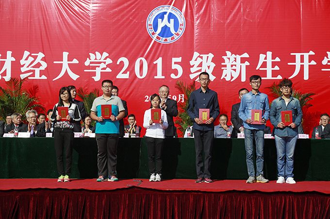 典礼开始,全体人员齐声高唱国歌。副校长聂培尧宣读《关于颁发2015级优秀新生入学奖学金的决定》,获得入学奖学金的同学上台领取奖金和证书。数学与数量经济学院王继强、管理科学与工程学院吴修国作为教师代表分别发言。校友代表、中国建设银行山东省分行副行长朱治昌致辞。在校生代表保险学院金相安,新生代表金融学院林久冉、会计学院宋建峰分别发言。典礼最后,全体新生作了庄严宣誓。