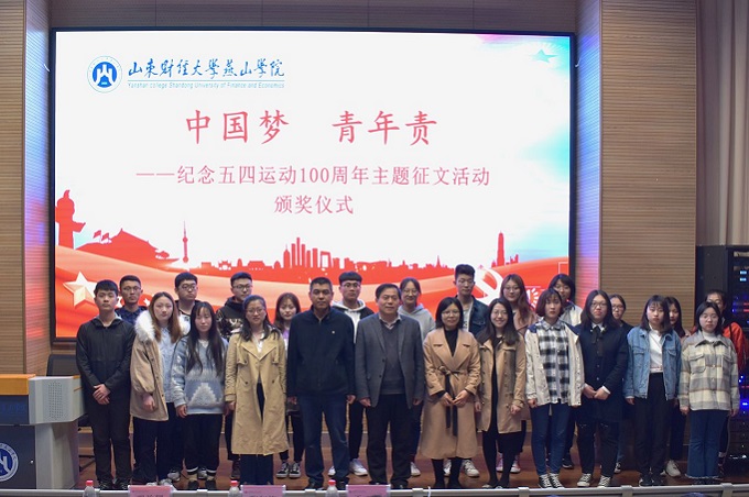 4月2日中午,我校“中国梦,青年责”纪念五四运动一百周年主题征文颁奖典礼在莱芜校区7111教室举行。校党委副书记张红旗,学生处处长巩治国,团委组织与文体科于慧老师出席颁奖典礼并为获奖同学颁奖。