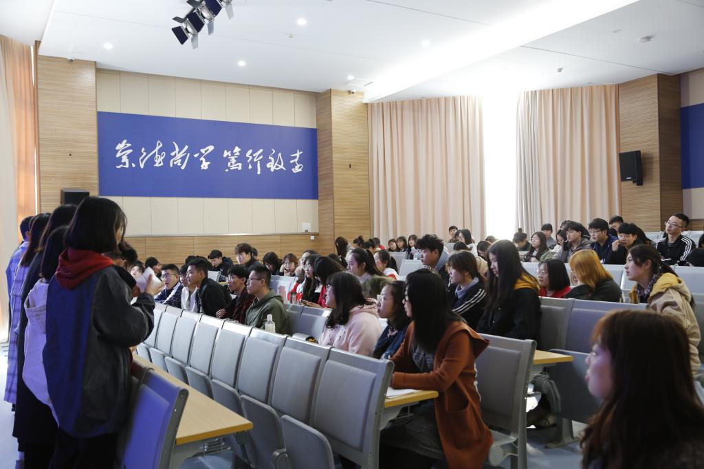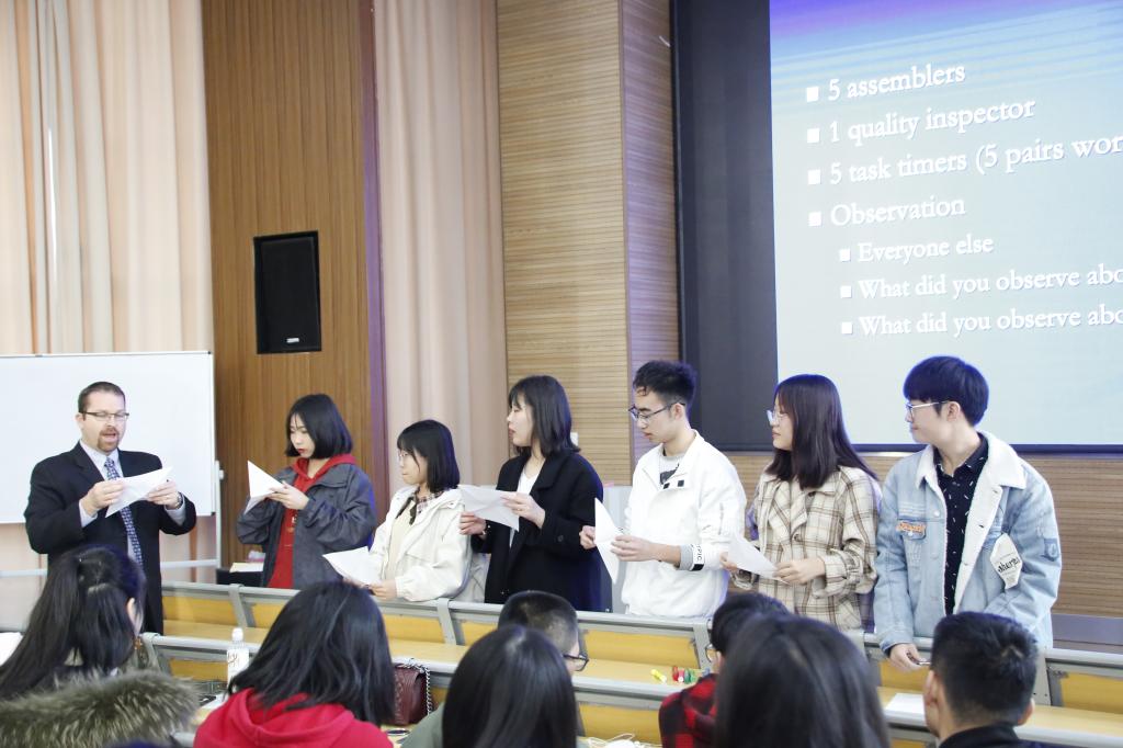 随后,Scott Hoefle教授在7111教室为同学们召开讲座。本次讲座以“供应链管理”为主题,Scott Hoefle以幽默风趣的语言、形象生动及专业化的讲解向同学们介绍了运营管理有关的名词,并通过经典的手工制作流程互动,使同学们对生产线的运作方式有一定的了解,鼓励同学们发散思维,了解供应链管理的相关知识,同学们踊跃参与,师生互动良好,现场氛围高涨。此外,曹丙寅全面地向同学们介绍了美国北亚利桑那大学相关信息,加深同学们对学校的了解。