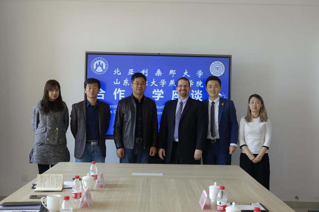 3月22日,我校与美国北亚利桑那大学在莱芜校区四楼会议室召开交流座谈会。北亚弗兰克商学院教授Scott Hoefle、北亚亚洲事务副主管曹丙寅、北亚授权合作机构代表苏薇薇、燕山学院副院长魏新刚、国际合作办公室主任蔡文春及相关负责人出席。