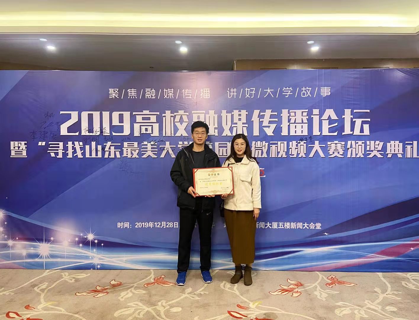 12月28日下午,我校参加2019高校融媒传播论坛暨“寻找山东最美大学校园”微视频大赛颁奖典礼。我校两个短视频作品荣获“优秀奖”,学校荣获“优秀组织奖”,同时被评为“2019年融媒体传播最具创新力高校”。