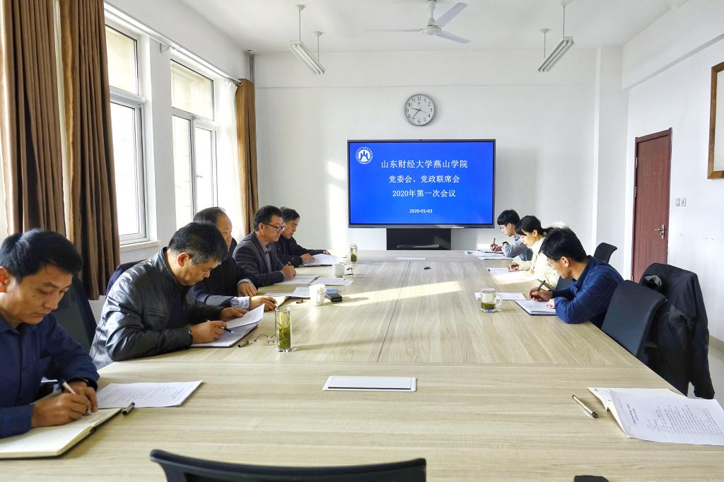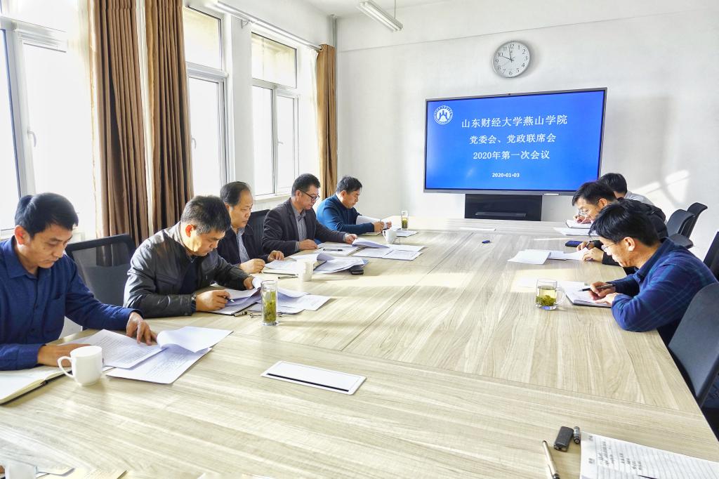 1月3号上午,山东财经大学燕山学院党委会、党政联席会2020年第一次会议在莱芜校区办公楼四楼会议室召开。院长刘瑞波、党委书记王松、副院长魏新刚、党委副书记张红旗、理事会理事王本义出席会议,各相关处室负责人列席会议。