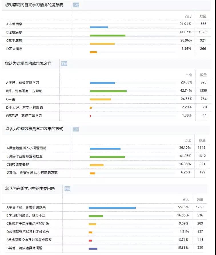 为更好地了解同学们的学习感受,我校开展了问卷调查。从中可以看出:多数学生对自己的自我学习状况以及线上教学的效果表示满意;不少同学建议应该用布置课后作业、进行随堂测试的方式来巩固学习成果;学习平台卡顿是在当前学习中遇到的主要问题。此次调查不仅统计了学子们的学习状况及感受,而且也反映了现阶段线上教学的不足,并为接下来的改善提供了珍贵的参考价值。