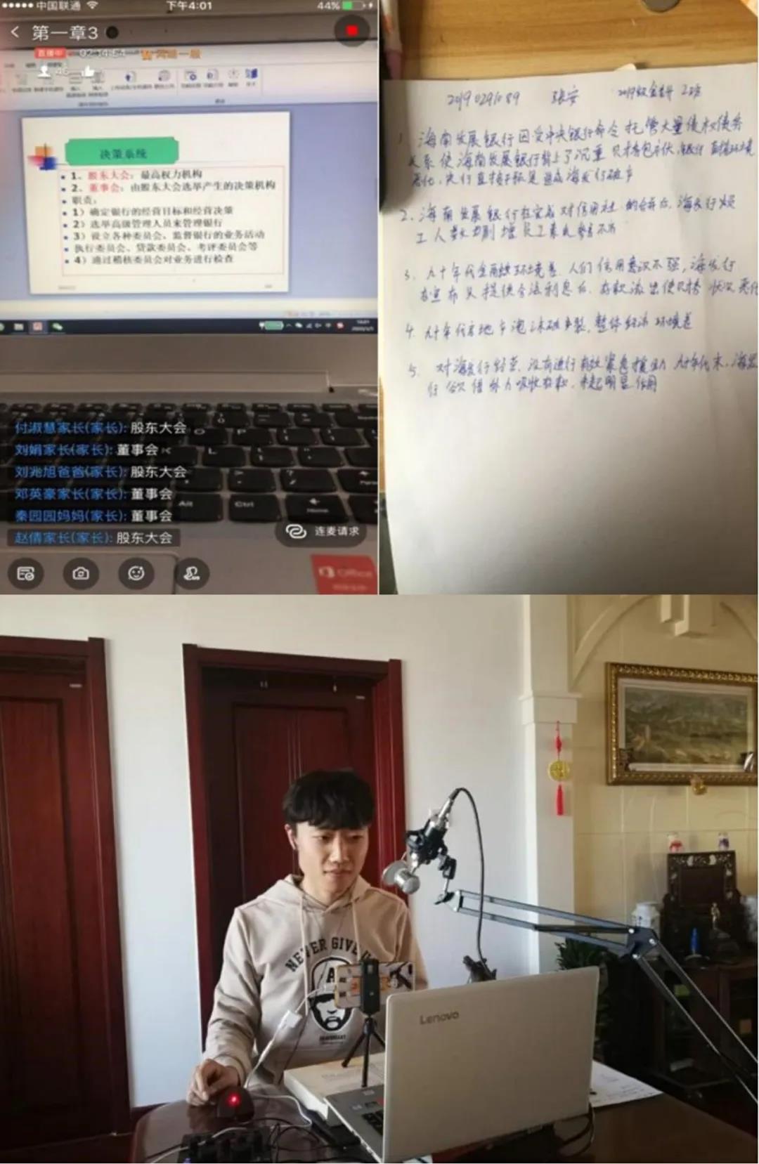 金融系则灵活利用网络工具提高教学质量。作为金融系的年轻教师,彭恂老师灵活运用各种直播硬件软件展开授课。他利用声卡、话筒等专业设备进行教学,使同学可以更清晰地听到授课内容。在课堂互动方面,彭老师利用教学软件的连麦、弹幕等功能,让同学们在线回答问题,形成课程的良好互动。在课堂作业方面,彭老师则采取让同学们手写作业并由学委统一上交给教师的方式来提高同学们的作业质量。这种方式不仅激发了学生们的学习兴趣,而且营造了浓厚的学习的氛围。