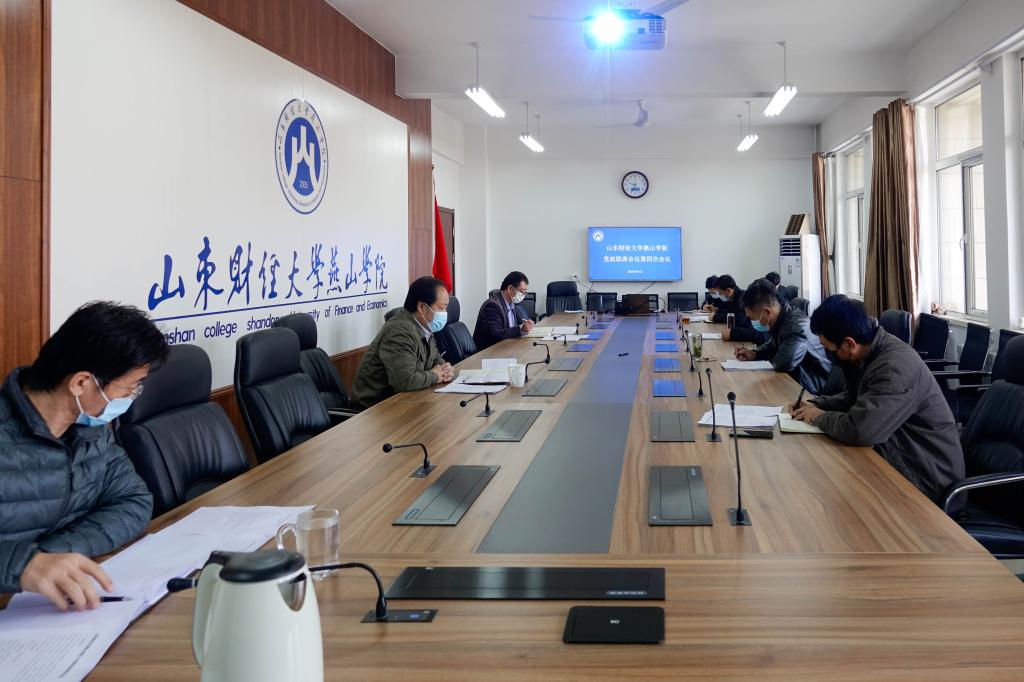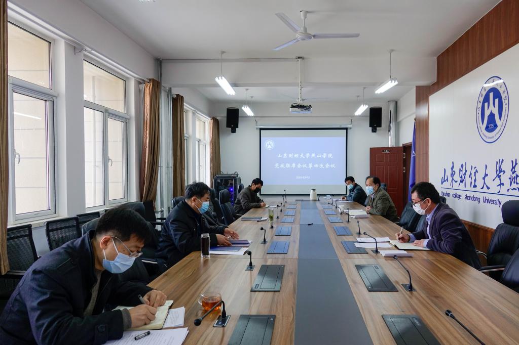 3月13号上午,山东财经大学燕山学院党政联席会第四次会议在莱芜校区办公楼五楼会议室召开。院长刘瑞波、党委书记王松、理事会理事王本义、副院长魏新刚、党委副书记张红旗、副院长李学峰出席会议,各相关处室负责人列席会议。
