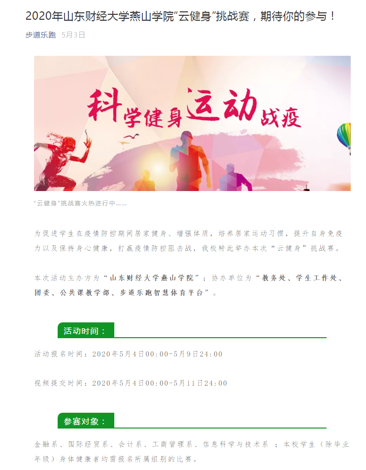 为促进学生在疫情防控期间居家健身,增强体质,培养健身运动习惯,提升自身免疫力以及保持身心健康,打赢疫情防控阻击战,我校于5月4日至5月11日举办本次“云健身”挑战赛。