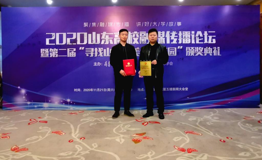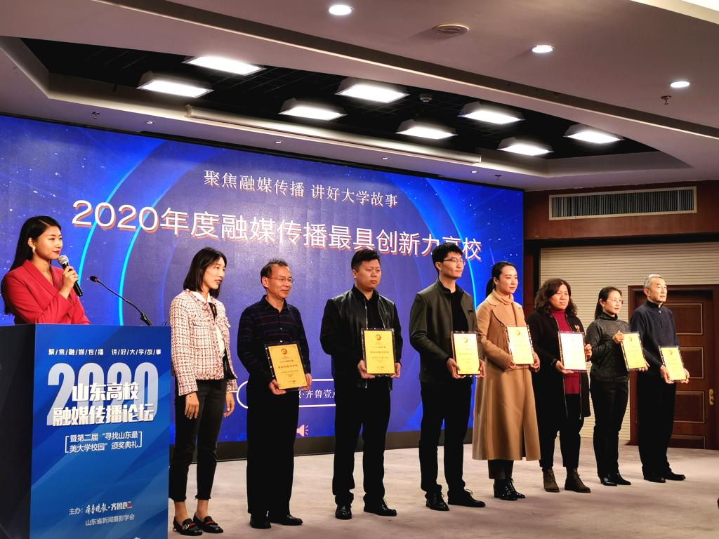 聚焦融媒传播,讲好大学故事。11月21日,2020高校融媒传播论坛暨“寻找山东最美大学校园”微视频、摄影大赛颁奖典礼在济南举办。我校获得“2020年度融媒传播最具创新力高校”等荣誉。