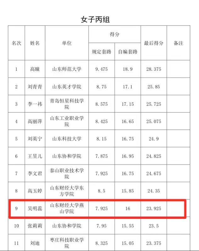 此次比赛全省高校体育教师同场竞技,其中参加高校基本功大赛(健美操)比赛的共有山东省27所高校,分别由山东师范大学、山东科技大学、曲阜师范大学、山东英才学院、泰山科技职业学院等组成。为了迎接此次比赛,吴明蕊在教学之余认真备赛,在赛场上挑战完成多项高难度动作,最终取得了健美操比赛三等奖的好成绩。