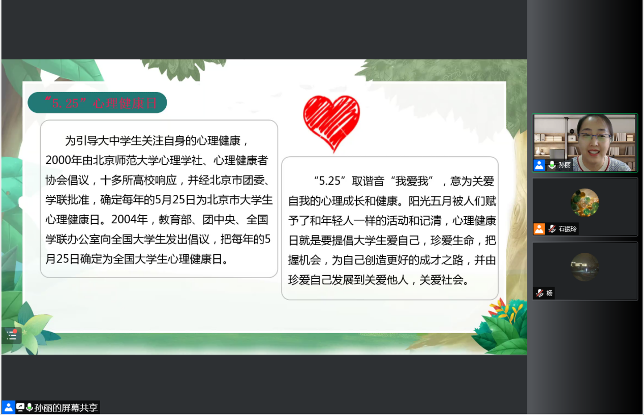 5月25日下午,我校举办“5·25”大学生心理健康日主题线上讲座。本次讲座邀请山东财经大学学生工作处心理咨询中心主任孙丽担任主讲人。山东财经大学燕山学院党委副书记杨和亭主持讲座,各班心理委员、宿舍朋辈志愿者、心理健康协会成员参加学习。