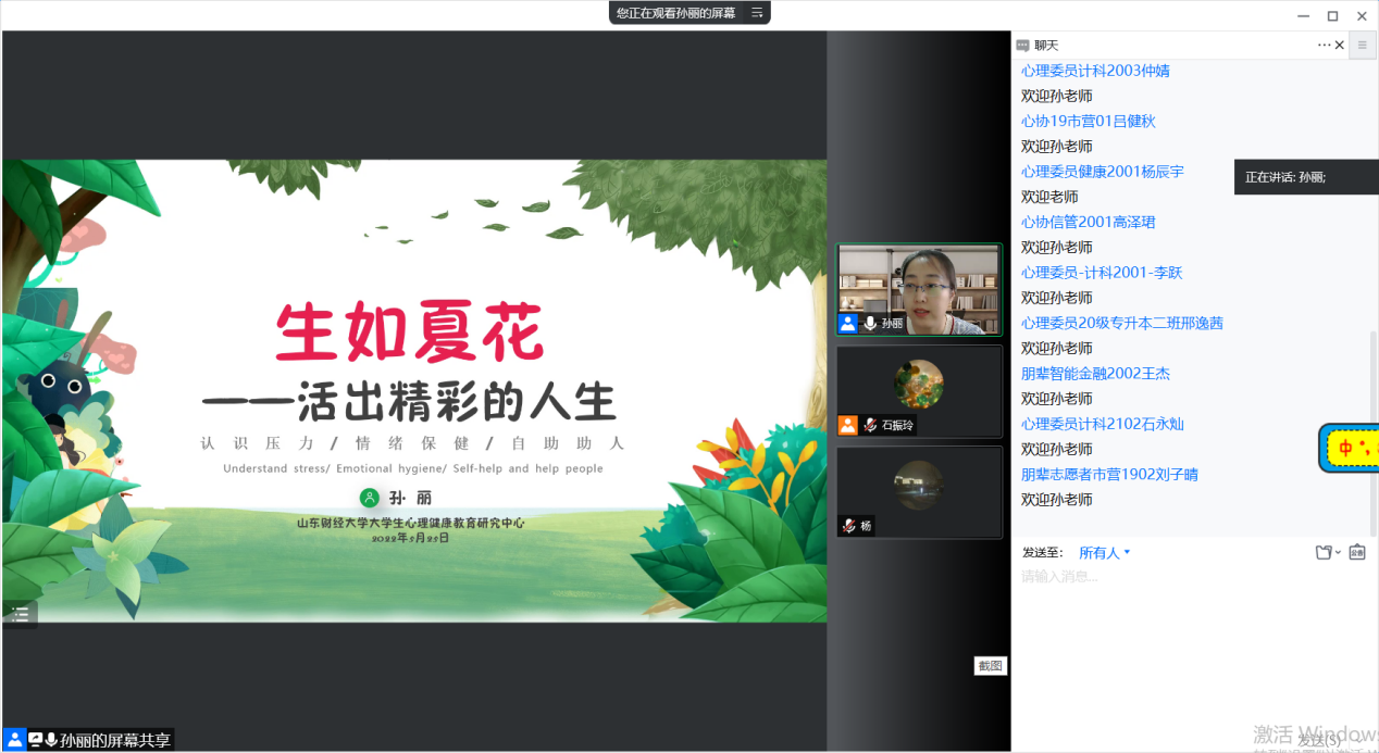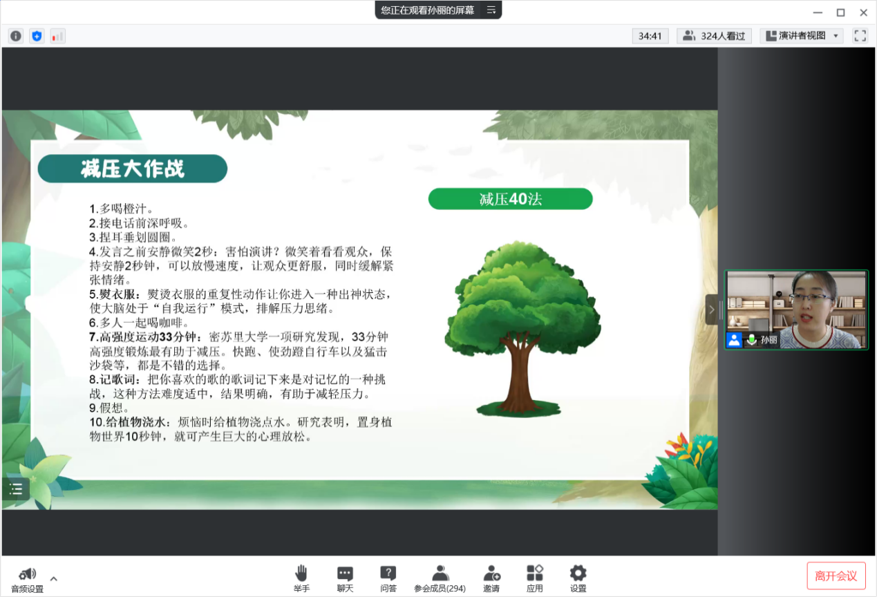 孙丽以泰戈尔《飞鸟集》中的一首“生如夏花”为切入点,引出本次讲座的主题:生如夏花——活出精彩人生。她围绕“认识压力、情绪保健、自助助人”三个方面,带领同学们逐步地认识压力,从而向同学们提出“与焦虑共处”的观点。她表示,当自己认识到压力时,要为自己贴上情绪创可贴。此外,孙丽贴切日常生活和大部分学生疫情封控下的心理状态,结合专业的心理健康知识,细致讲解了减压40法,从简单的自我调适到求助学校专业的心理咨询师,引导学生了解自己的心灵,感受人生的独特性和有限性,从而更加热爱生命。