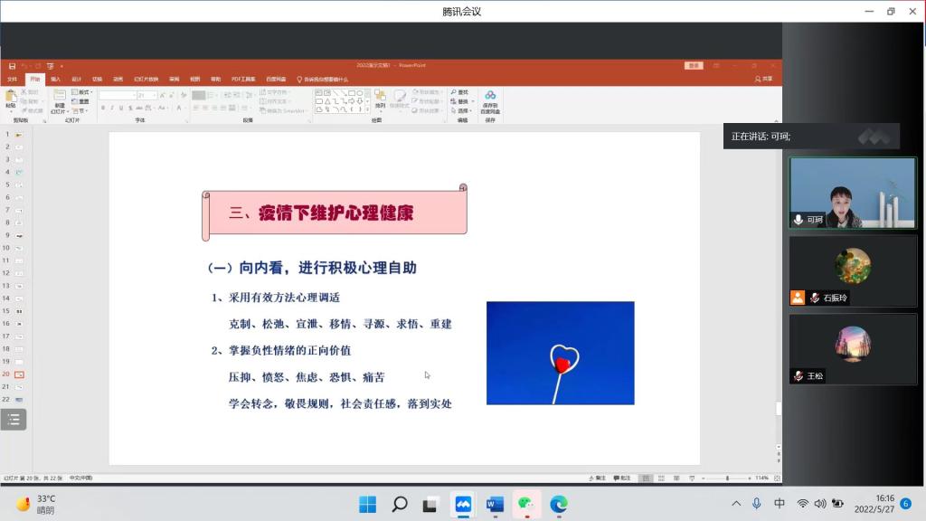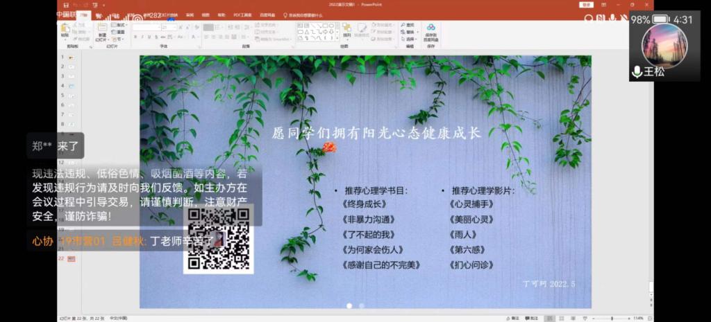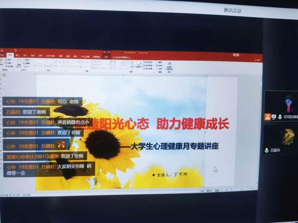 讲座以“塑造阳光心态,助力健康成长”为主题展开。首先,丁老师讲解了什么是心理健康和心理健康的标准,分析了大学生几种常见的心理障碍及其成因,并通过北大学霸吴谢宇的人伦悲剧,指出决定人生成败的往往不是分数的高低,而是人格的健全,对于正在走向成熟但并未完全成熟的大学生来说,加强心理建设尤为重要。随后,丁老师分别就认识自我悦纳自我、和情绪管理合理宣泄两个方面,论述了如何加强大学生心理健康。她结合实例,指出要珍惜自己的独特性,和应对不良情绪要学会换个角度想问题,以及保持积极阳光的心态,是当代大学生拼搏进取的精神源泉。最后,丁老师紧贴时事,提出同学们在疫情期间更要注重维护心理健康,既要注重内因,积极心理自助,掌握负性情绪的正向价值,看到困境同时存在着积极的因素,又要重视与外部环境的沟通,建立社会支持系统。着重强调心理问题并不可怕,勇于面对是负责任、有智慧的表现。同时,她提醒同学们要理性看待问题,培养大学生社会责任感,推进防疫工作的顺利进行。