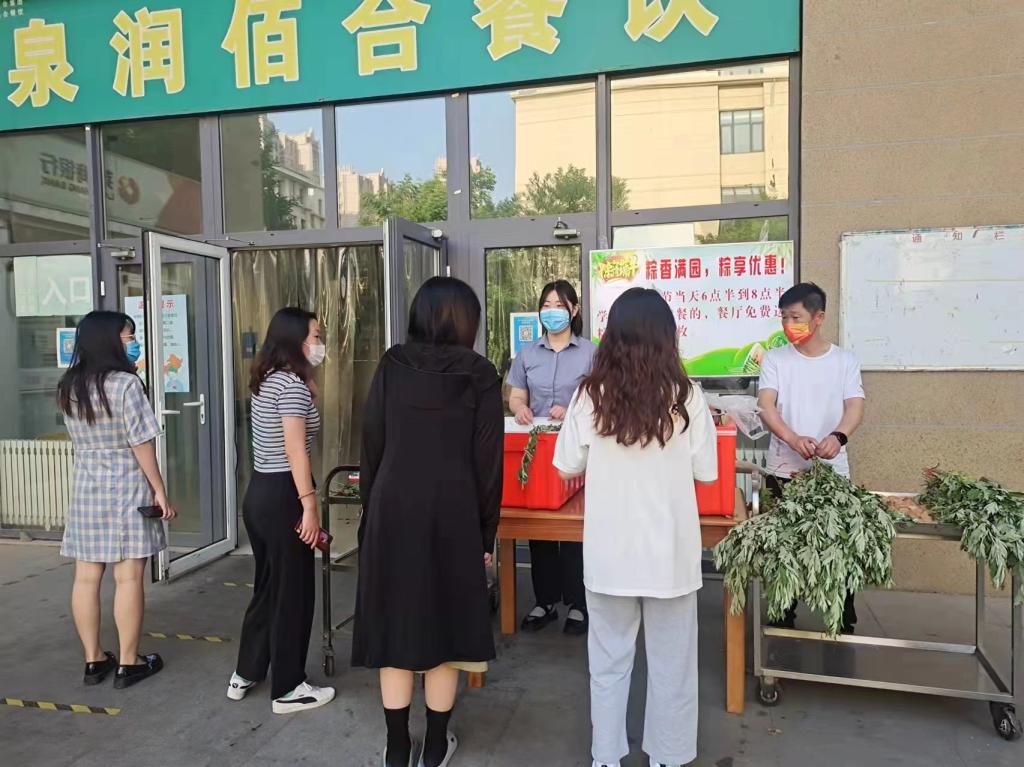 上午,学校后勤保障处安排工作人员在餐厅西门免费发放粽子、鸡蛋和艾草,为同学们送上美好的节日祝福,祝同学们平安喜乐、端午安康。