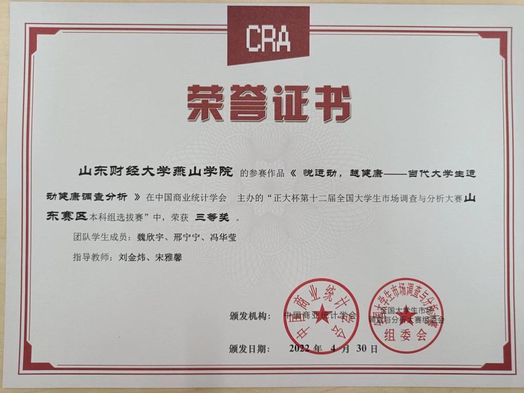 近日,由中国商业统计学会主办的“正大杯”第十二届全国大学生市场调查与分析大赛选拔赛在各省市陆续开展。其中,山东赛区选拔赛(研究生组和本科组)已于近期顺利开展并公布评选结果。山东赛区选拔赛在山东大学举办,共有283支本科生参赛队伍。根据评选结果,我校推荐参与本科组评选的2项作品获得省级三等奖。
