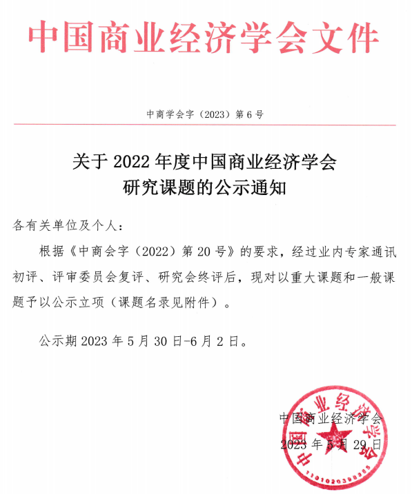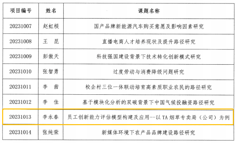 近日,2022年度中国商业经济学会研究课题立项名单公示,学校工商管理学院李永春院长带领工商管理学院教师辛玉婷、于春欣、曹淑霞和李小燕完成的《员工创新能力评估模型构建及应用——以TA烟草专卖局(公司)为例》获批立项,斩获佳绩。