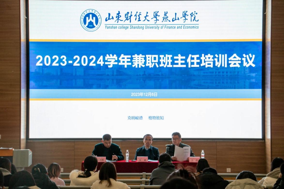 为深入贯彻立德树人根本任务,提升兼职班主任工作能力,12月6日下午,山东财经大学燕山学院在7111教室召开2023—2024学年兼职班主任培训会议。学院党委书记张建、正处级组织员王松出席会议,全体兼职班主任和辅导员参加会议。