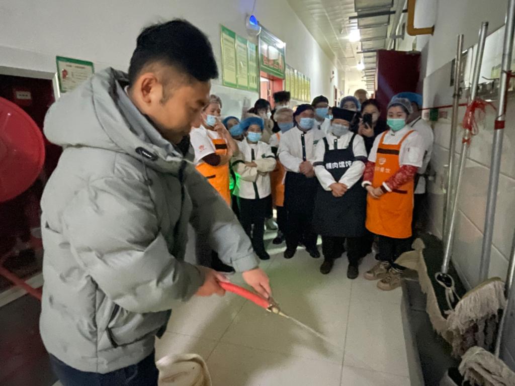 1月9日中午,培训人员和食堂全体员工首先在南食堂一楼,进行了厨房设备灭火装置自动启动和手动启动两种灭火方法,以及灭火毯的使用专项培训。并在食堂后厨走廊,进行了寻找并打开消防箱,使用消防卷盘和水带水枪进行非油电类初起火灾扑救的实操体验活动。