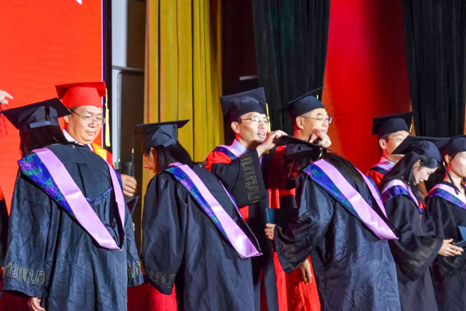毕业典礼结束后,随着悠扬的歌曲旋律,2024年毕业生学位授予仪式正式启动。副院长李学峰宣读了《2024届毕业生学士学位授予决定》,获得学位的毕业生分批登台,校领导与学位评定委员会委员依次为他们拨穗、颁发学位证书,并合影留念。