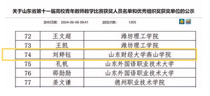 近日,山东省教育厅公布了山东省第十一届高校青年教师教学比赛获奖人员名单和优秀组织奖获奖单位。经过激烈角逐,山东财经大学燕山学院国际商学院教师刘婷钰荣获三等奖。此次比赛成绩的取得,实现了学校历年来参加此项比赛所获奖项的新突破,是学校积极推进教学改革、提升教师个人素质和业务水平的成果。