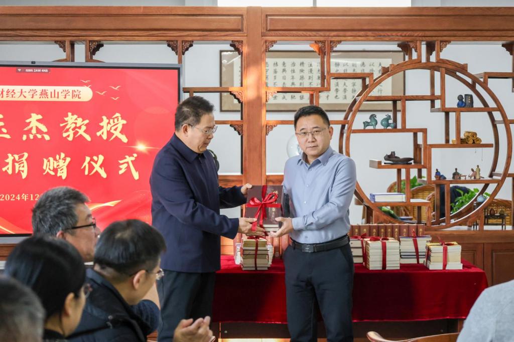 12月27日下午,山东财经大学燕山学院原院长孙玉杰教授图书捐赠仪式在图书馆传统文化空间举行。燕山学院领导班子成员、中层正职以及图书馆全体工作人员参加活动。图书馆馆长杨和亭主持活动。