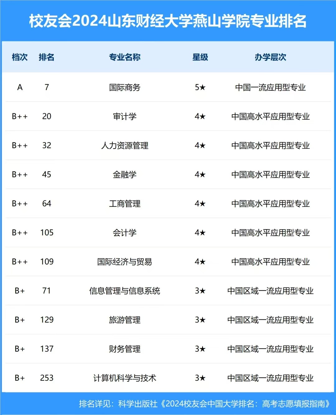 在日前发布的校友会2024中国民办大学排名中,山东财经大学燕山学院位列全国第33名,名列2024中国财经类民办大学排名第15名,位列2024山东省民办大学排名第6名。榜单显示,在校友会2024中国大学一流专业排名(应用型)中,山东财经大学燕山学院位居全国第568名,共有1个专业评级为中国五星级专业(5★),6个专业评级为中国四星级专业(4★),4个专业评级为中国三星级专业(3★)。在2024中国大学专业分档排名中,山东财经大学燕山学院1个专业评为A,6个专业评为B++,4个专业评为B+,3个专业评为B,位居全国同类高校前列。