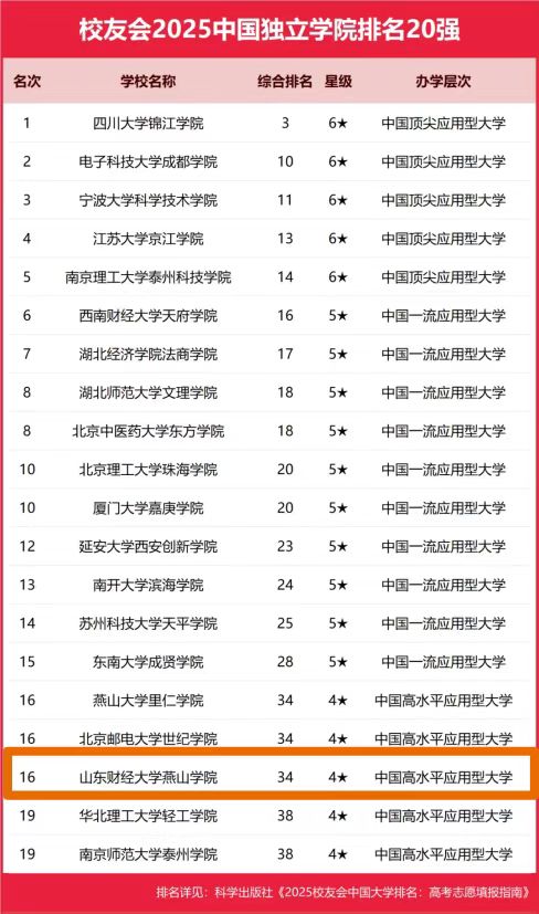 1月6日,全国第三方大学评价研究机构艾瑞深校友会网正式发布校友会2025中国大学排名,山东财经大学燕山学院凭借高质量办学位列校友会中国独立学院排行榜第16名,荣膺中国四星级应用型大学(4★)美誉,跻身中国高水平应用型大学行列。