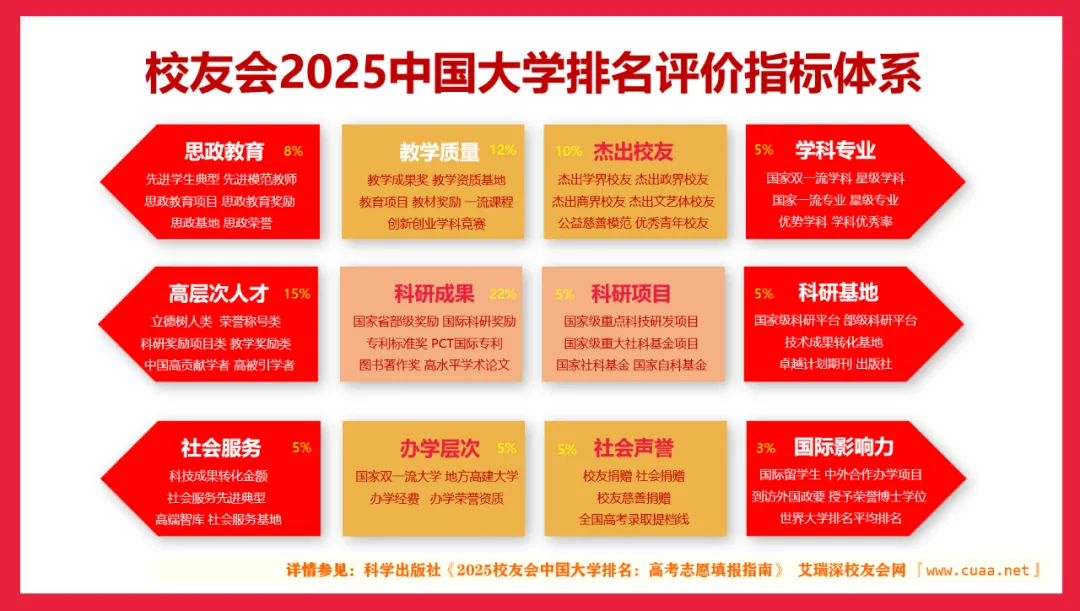 校友会2025中国大学排名评价指标体系由办学层次、思政教育、教学质量、杰出校友、高层次人才、学科专业、科研项目、科研基地、科研成果、社会服务、社会声誉和国际影响力等12个一级指标组成,基于“大平台、大团队、大项目、大成果、大校友”体系框架展开系统评价,覆盖的评估指标高达900多项。评价指标体系的独立性、创新性、前瞻性远远领先于其他排行榜。