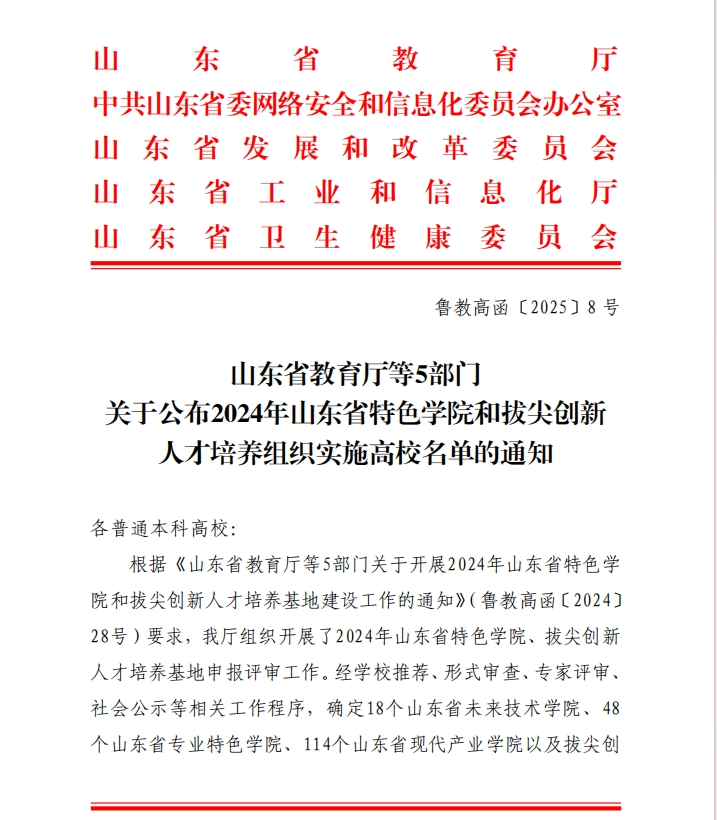 近日,山东省教育厅等5部门《关于公布2024年山东省特色学院和拔尖创新人才培养组织实施高校名单的通知》(鲁教高函〔2025〕8号)发布,我校申报的“跨境电商现代产业学院”获批山东省现代产业学院,成为我校首个省级现代产业学院。