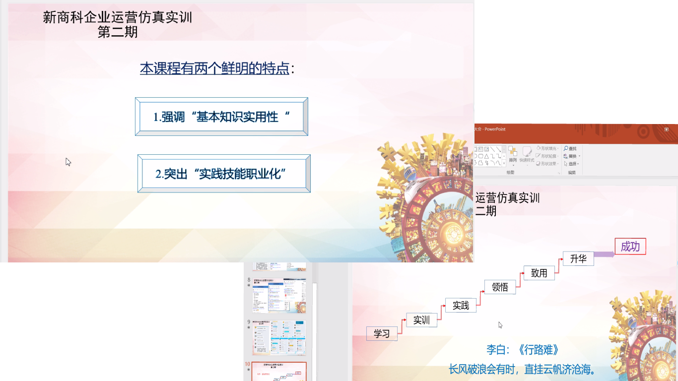 会议首先由王俊籽主任进行总结发言,王主任由于有课程任务在身无法实时参加会议,就通过录制视频的方式参加了会议。王主任首先对同学们顺利完成实训课程表示祝贺,向全程参与教学的老师们表示感谢。她指出,实践教学是高校大学生人才培养的重要环节,我校对实践教学高度重视,新商科企业运营仿真实训课程是通过以真实的商业社会环境为原型仿真现代企业与现代服务业运营环境的经营模拟学习平台,以企业经营与管理为主体,建立虚拟商务环境、政务环境公共服务环境进行虚拟仿真经营和业务运作,课程有两个鲜明的特变:一是强调“基本知识实用性”;二是突出“实践技能职业化”。接下来王主任对课程的各个环节进行了总结点评,对学生和老师们在课程中表现出的热情、敬业、专注表示了肯定。 最后王主任把“长风破浪会有时,直挂云帆济沧海”的诗句送给了全体同学们,并祝同学们前程似锦,不负韶华。