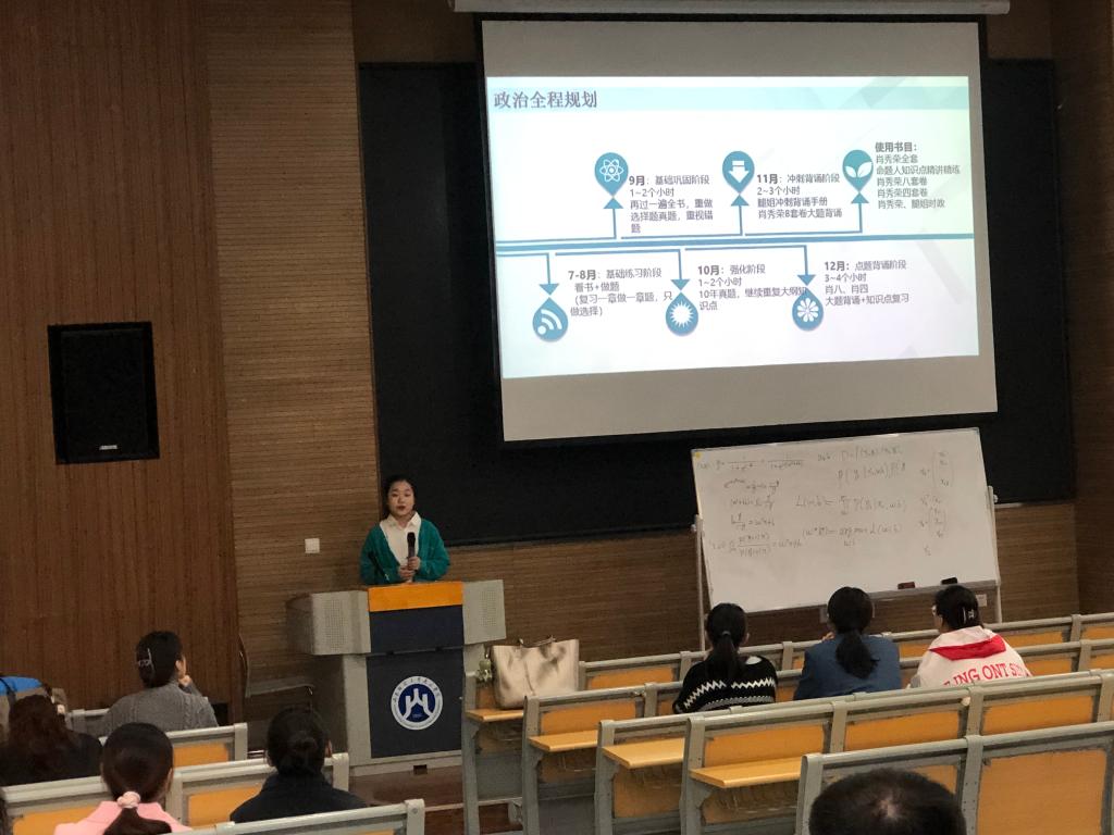 在交流分享环节,考取山东财经大学学硕的郭珍就择校、初试与复试和调剂等方面分享了她的备战经验。郭珍指出,报考前一定要充分了解意向院校的学制、考试要求与内容,根据自身能力选择相当的院校至关重要。她不仅分享了在初试准备阶段对政治、英语、数学及专业课做的时间规划,更是将参考书籍及备考方法做了详细的说明,让茫然混乱中备战同学豁然开朗。此外,郭珍也对复试中的笔试、面试注意事项做了说明。郭珍以自身为例讲到她虽以400分的高分进入南开大学复试,但在参考往年录取结果时察觉自己可能失利,及时调整状态顺利调剂到山东财经大学,也不失精彩。