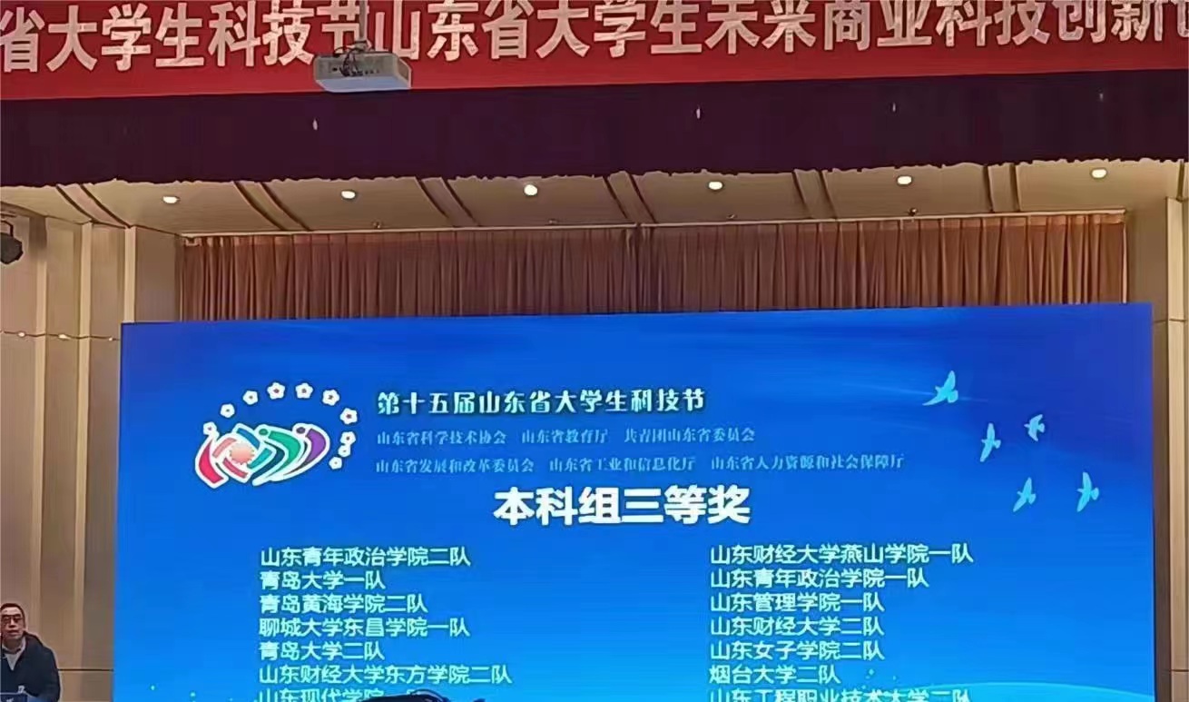 12月2日,第十五届山东省大学生科技节山东省大学生未来商业科技创新创业大赛在烟台大学举行,经过一番激烈的角逐,由实验实训教学中心王俊籽、吴美典子老师指导,张坤老师带队的孙浩彦、潘茹浩、殷维玮、赵咏荷4名同学组成的燕山学院代表队在比赛中发挥出色,获得三等奖。