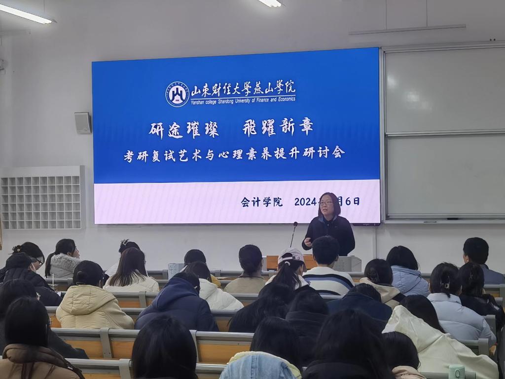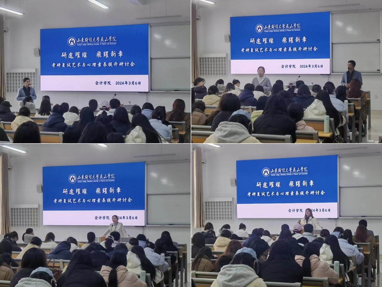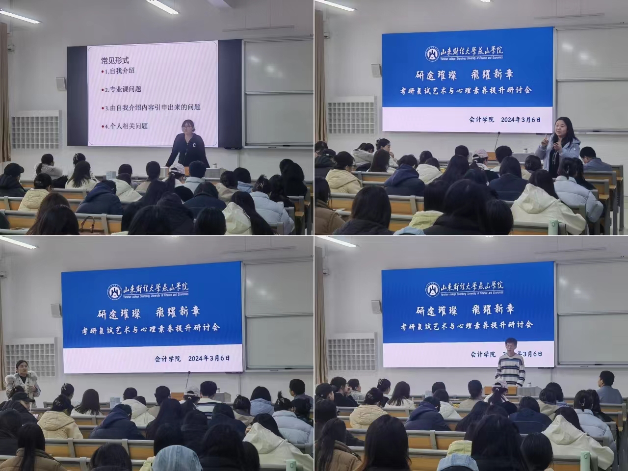 为帮助学生熟悉考研复试情况、助力考生提升复试竞争力,会计学院于3月6日下午联合辅导员举办了“研途璀璨,飞跃新章”主题考研复试艺术与心理素养提升研讨会。研讨会由会计学院院长刘惠萍主持,会计学院各专任教师和山东财经大学在读硕士研究生分别从不同方面分享经验并提供全面指导。