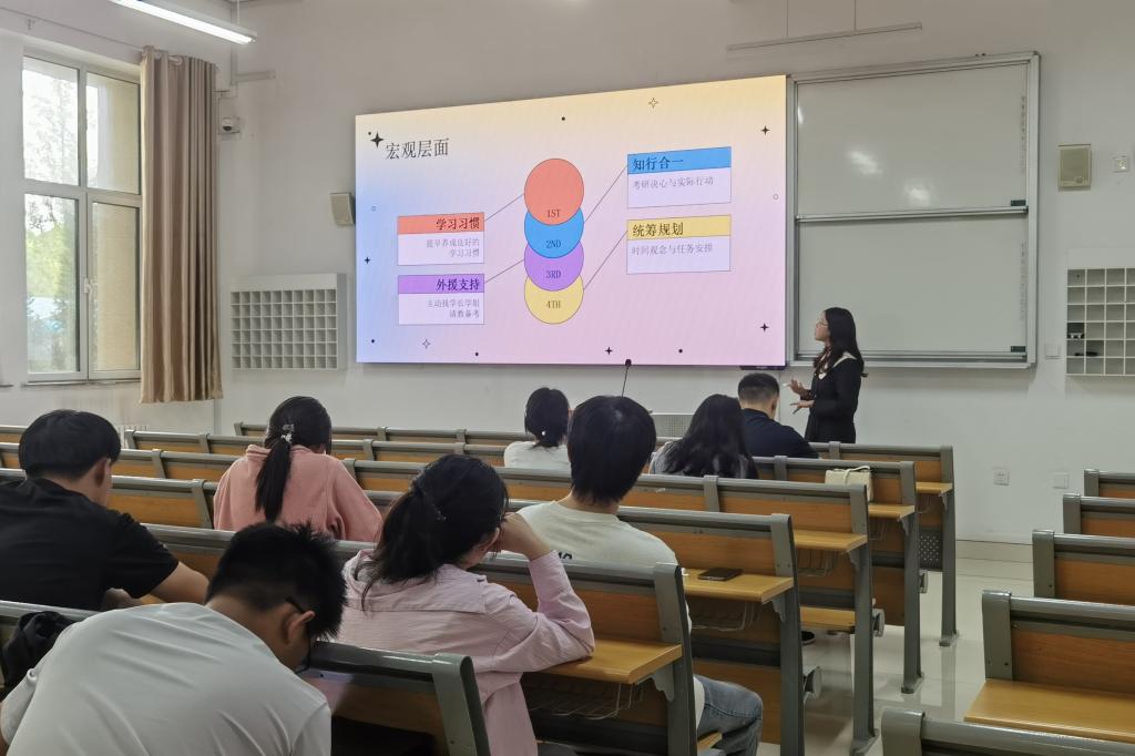 程念西老师从“为什么要考研”入手,基于个人和社会两方面因素向同学们分析并介绍了当前考研的考情以及考研的益处。分享了自身的考研经验与具体的备考策略。