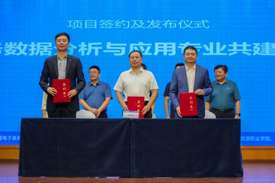 会上,校行企三方围绕“商务数据分析与应用专业共建项目”、“全域零售人才培养试点项目”、“数字赋能产教融合实训基地共建项目”、“全国农旅电商产教融合共同体发起单位签约”举行项目签约仪式。