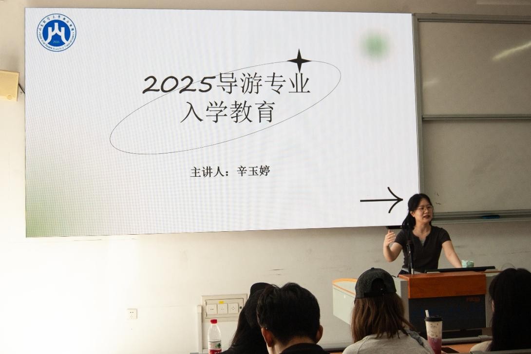 导游专业--明确职业方向,助力升学就业。辛玉婷老师为导游专业新生明确传统景区导游、文旅新媒体运营等就业方向,梳理核心课程知识点与技能要求。针对有升学需求的新生,她详细讲解专升本考试科目与报考流程;在综合提升方面,提及相关职业资格证书,鼓励新生通过考证增强竞争力,并推荐多元实践平台。最后,老师以“敢为天下先,心怀天下事,求真无止境”寄语,为新生注入学习动力。