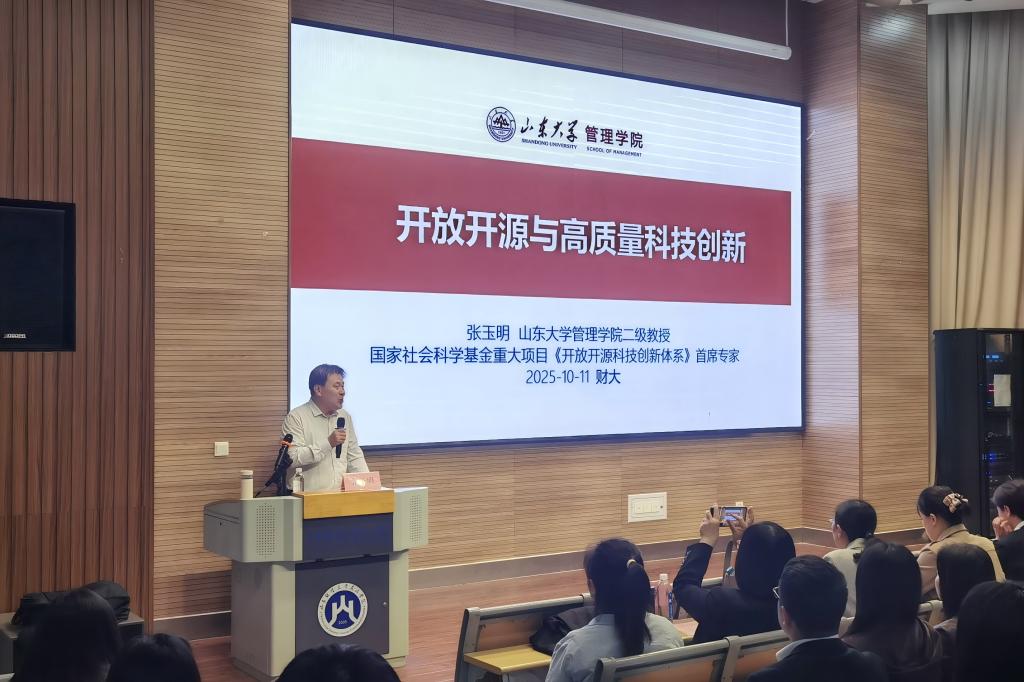 随后,张玉明教授以“开放开源是突破高质量科技创新瓶颈的关键路径”为核心论点展开分享。他指出,在全球科技创新竞争加剧的背景下,开源模式以协同创新、技术普惠、生态共荣的显著优势,成为推动原始创新的重要抓手。开放开源通过打破技术研发封闭性,汇聚全球创新资源,为实现从“技术跟随”到“自主创新”的跨越提供了有效路径,更为会计、工商管理等学科与科技创新的融合提供了全新思路。