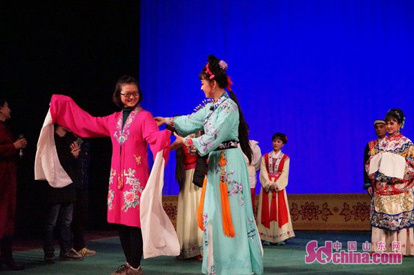 中国山东网12月16日讯 (记者 马文文)“终于圆了我的一个舞台梦!”这是大学生王梦竹在舞台上试穿戏服时发出的由衷感慨。12月15日晚,省吕剧院“戏曲进校园”公益演出活动走进了山东财经大学,数百名大学生不仅欣赏了诙谐幽默的吕剧小戏《砖头记》和经典传统吕剧《姊妹易嫁》,而且多位大学生还走上舞台与演员们面对面交流,零距离感受吕剧的艺术魅力。