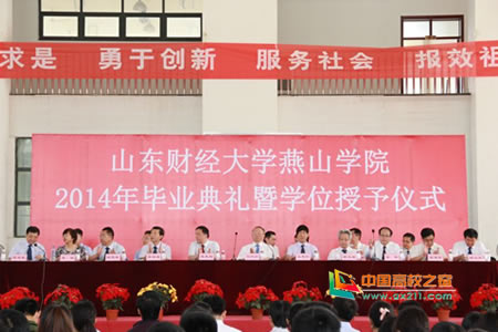 6月13号上午9时, 山东财经大学燕山学院2014年毕业生毕业典礼暨学位授予仪式在明水校区体育馆举行。山东财经大学党委书记、校长、山东财经大学燕山学院董事长刘兴云,山东财经大学党委副书记、纪委书记、山东财经大学燕山学院副董事长牟思伦,山东财经大学党委副书记张东超,副校长胡文波、李明勇,副校长、山东财经大学燕山学院副董事长、院长吴彬出席。山东财经大学党委办公室负责人、山东财经大学燕山学院有关领导以及明水校区综合办负责人和 2077名毕业生,毕业生家长代表和山东财经大学燕山学院全体教职工参加了典礼。