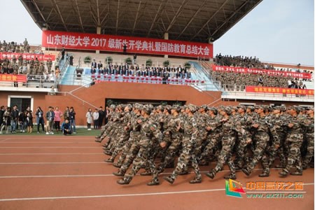 校党委书记王邵军宣布山东财经大学2017级新生开学典礼暨国防教育总结大会开始。在全体人员迎国旗,齐声高唱国歌、升国旗后,军训团进行了分列式及表演课目演练,海军手旗、擒敌拳、战术、木质警棍、捕俘刀、活字印刷、军体拳等不时博得阵阵掌声。