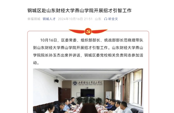 10月16日,区委常委、组织部部长、统战部部长范晓琨带队到山东财经大学燕山学院开展招才引智工作。山东财经大学燕山学院院长孙玉杰出席并讲话,钢城区委党校相关负责同志参加活动。