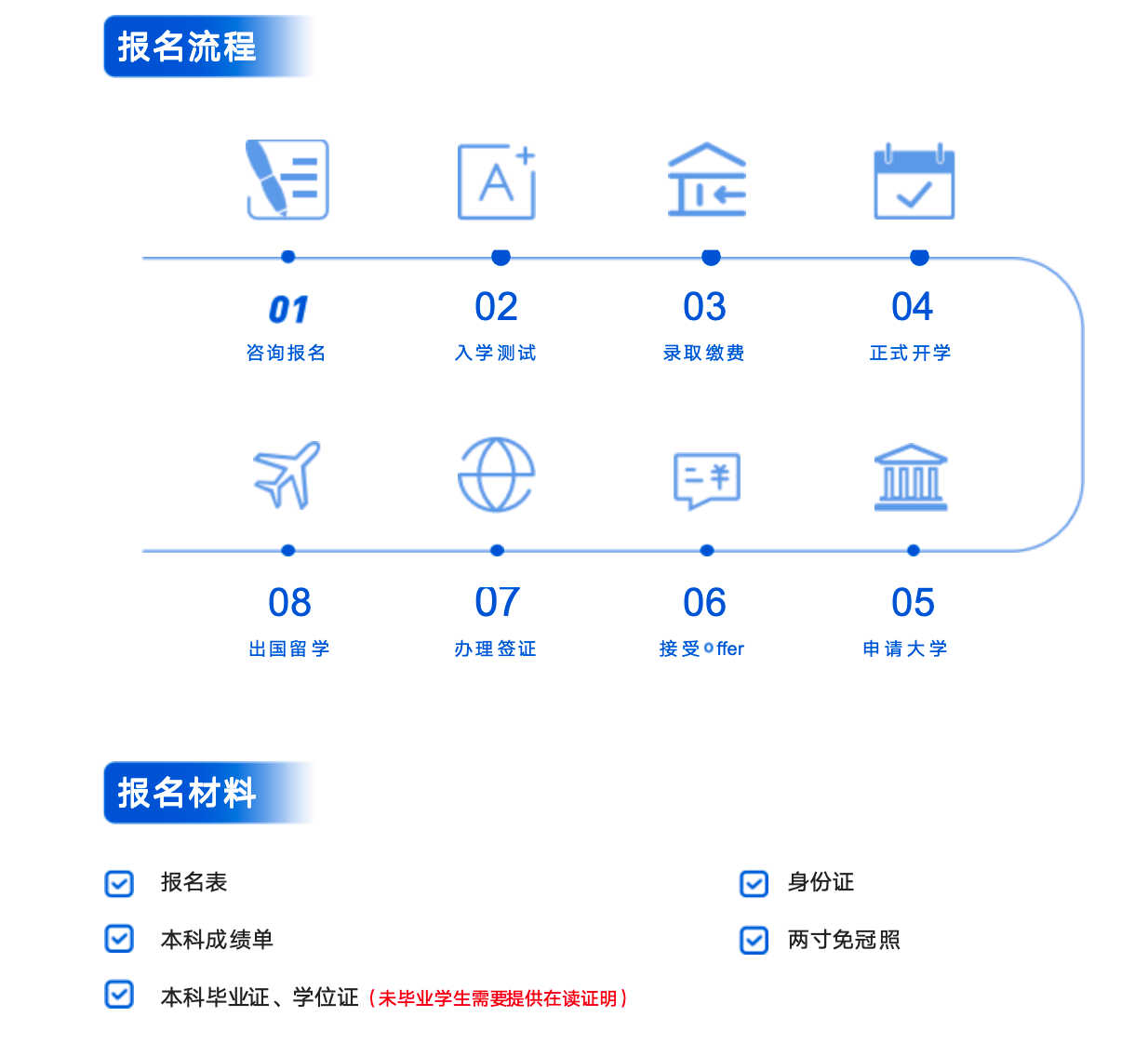 报名方式:需经历咨询报名、入学测试、录取缴费、正式开学等流程,报名时需提交报名表、本科成绩单、本科毕业证和学位证(未毕业学生提供在读证明)、身份证、两寸免冠照等材料。