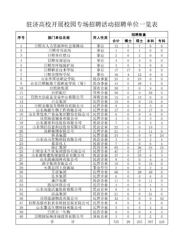 为贯彻落实全市招才引智工作有关安排部署,进一步加大高校毕业生引进力度,日照市将于12月10日-11日组织市内重点企事业单位赴山东大学等驻济高校开展校园专场招聘活动。活动项目包括人才创新创业政策宣讲会、招聘单位情况推介会及校园现场招聘会 。宣讲会项目将由市校联合共同宣传推介日照市情、人才创新创业政策、高校毕业生就业创业政策;推介会项目将选择部分市内重点企事业单位向高校老师、辅导员和应届毕业生推介本单位情况、招聘计划和寻求合作项目;招聘会项目将组织市直、区县事业单位和各类性质企业单位在山东大学等5所高校现场招聘展位,接待求职毕业生和寻找研究成果转化教授,为供求双方搭建见面交流平台。本次活动将先后在山东大学(12月10日上午)、山东财经大学(12月10日下午)、山东建筑大学(12月10日下午)、济南大学(12月11日上午)和齐鲁工业大学(12月11日下午)等5所高校举行。日照市人社局、司法局、住建局下属事业单位及日照港集团、日照银行等国有企业以及市内其他重点企事业单位共计40家部门单位报名参加,需求720人,其中,博士28人,硕士265人,本科307人,专科120人。目前,岗位征集、单位报名等工作已经完成,其他筹备工作正在有条不紊地开展。事业召唤人才,创业成就人才,我们真诚邀请和欢迎各位优秀毕业生到现场交流洽谈,共谋合作与发展!