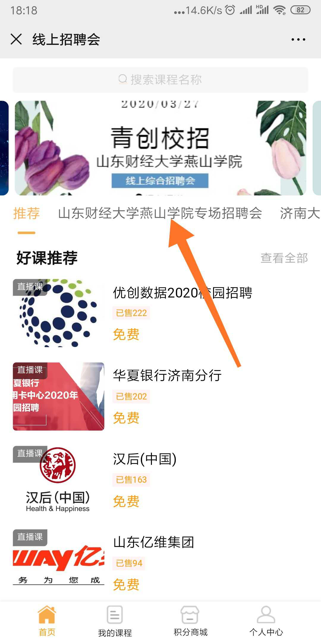 3、进入企业直播双选:点击山东财经大学燕山学院专场招聘会分组或轮播图片即可进去招聘专区,点击企业名称观看企业招聘直播,可在讨论区留言互动,按照企业要求投递简历,约定面试等