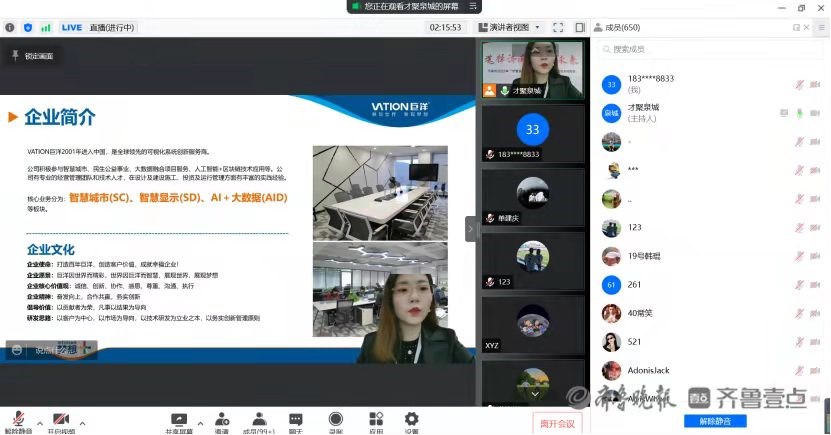 对接会开始之前,济南市人才服务中心副主任马炳玉同志为济南市“代言”,对济南市的发展前景、引才政策和人才安居等方面进行了详细解读;济南市人才服务中心规划引进部部长李文利同志对整个云端宣讲活动的议程安排和具体流程进行了详细介绍;“青岛站”云端引才对接会由济南市人才服务中心规划引进部副部长陈雅梦同志主持,历下区公共就业和人才服务中心科长祝杰宣讲了区域政策。山东省建设建工(集团)有限责任公司、山东未来集团有限公司、巨洋神州科技集团有限公司、济南黄河路桥建设集团有限公司、济南晶恒电子有限责任公司、山东中创软件工程股份有限公司、济南奥图自动化股份有限公司、润华集团股份有限公司等8家济南优选企业先后在云端进行了企业宣讲和岗位推介,各用人单位诚意十足,展示出各自的优势、福利、服务等一系列“干货”,一切只为吸引更多的人才来济工作,来济生活。